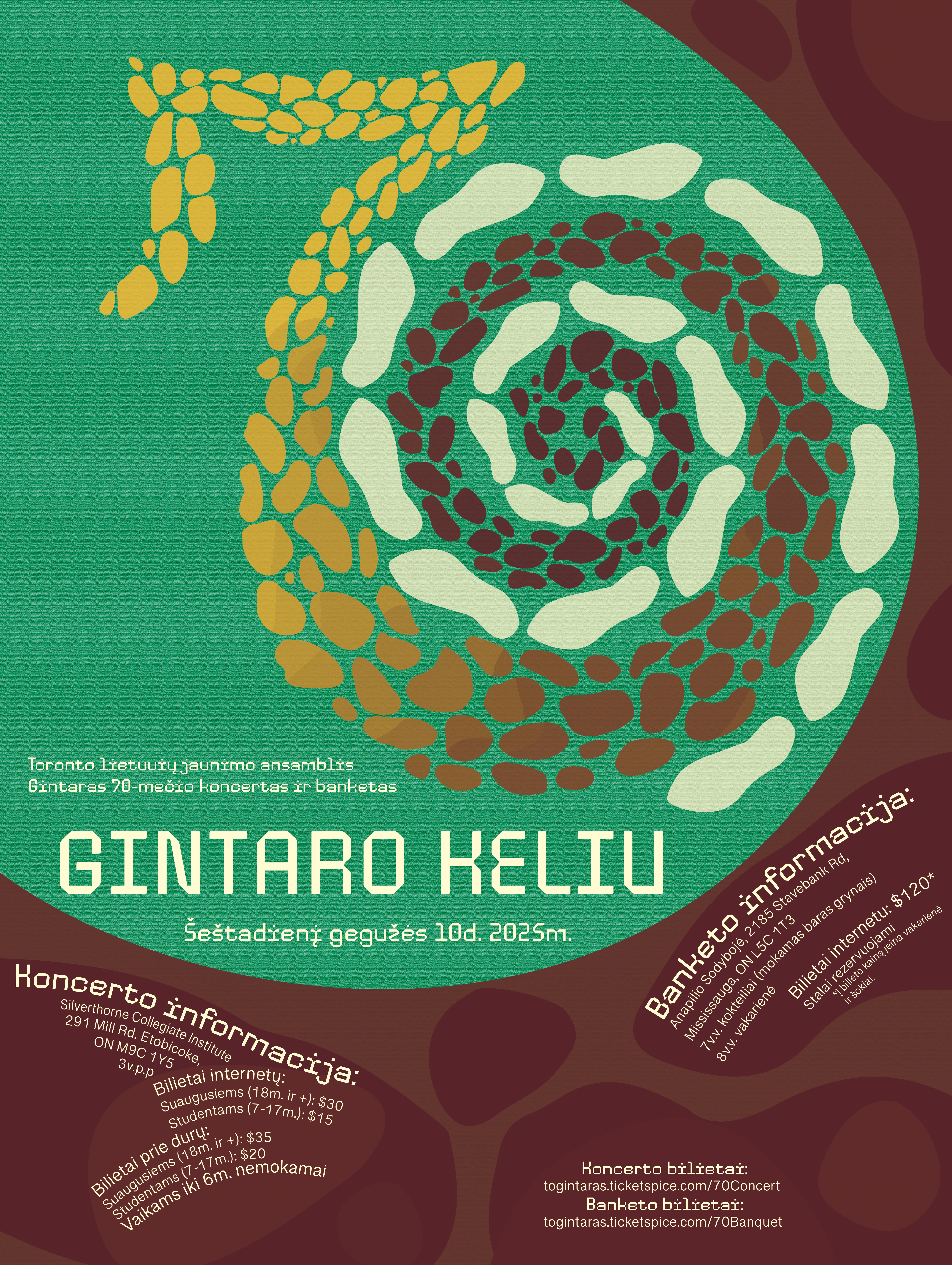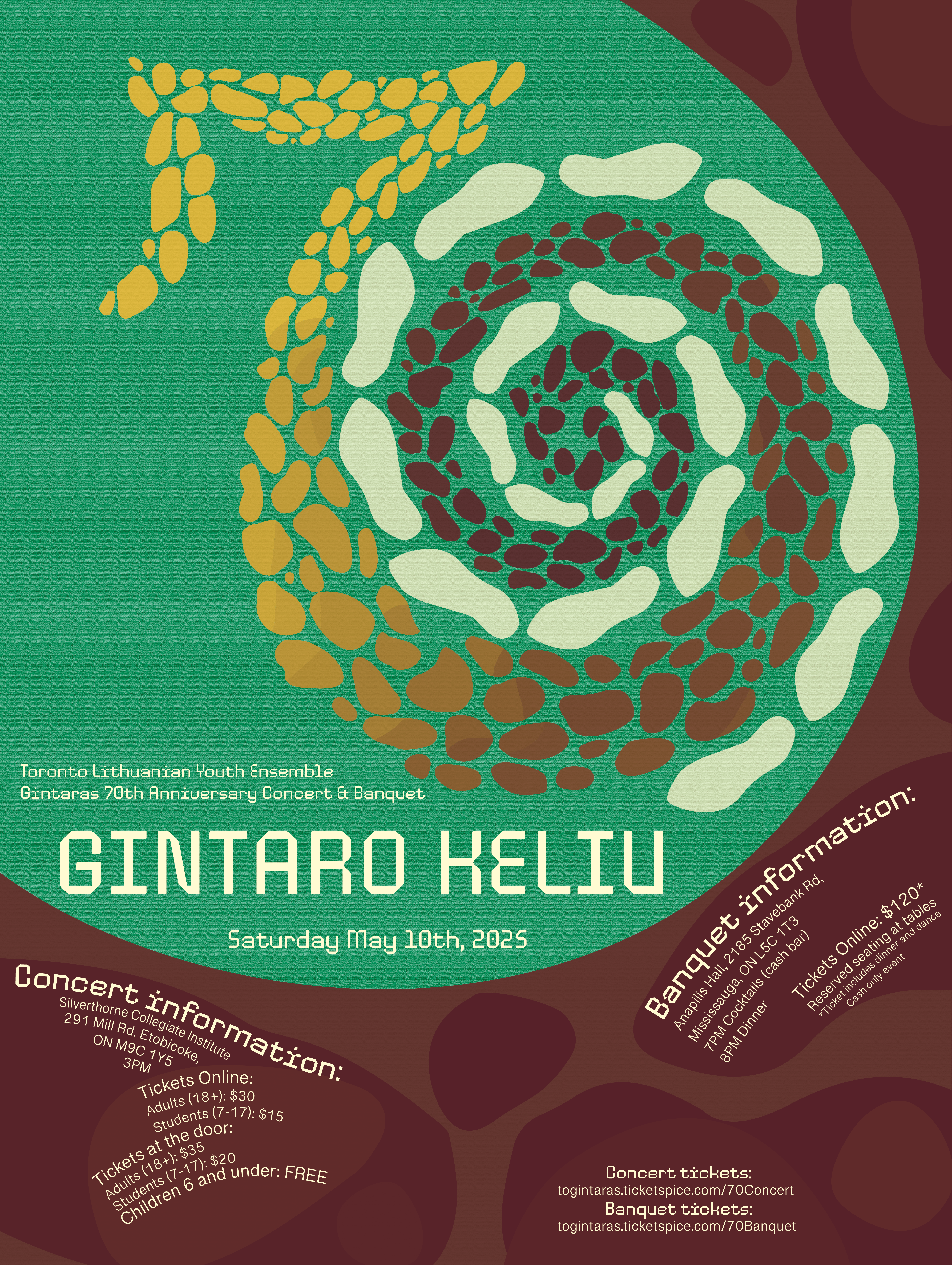 Gegužės 10 d. koncertas vyks 15:00 val. Silverthorne Collegiate Etobicoke. Visi bilietai yra bendrojo įėjimo (be vietų pasirinkimo). Suaugusiesiems bilietai kainuoja 30 dol., jaunimui nuo 7 iki 17 metų – 15 dol. , vaikams iki 6 metų – nemokamai. Bilietus galima įsigyti čia: https://togintaras.ticketspice.com/70concert