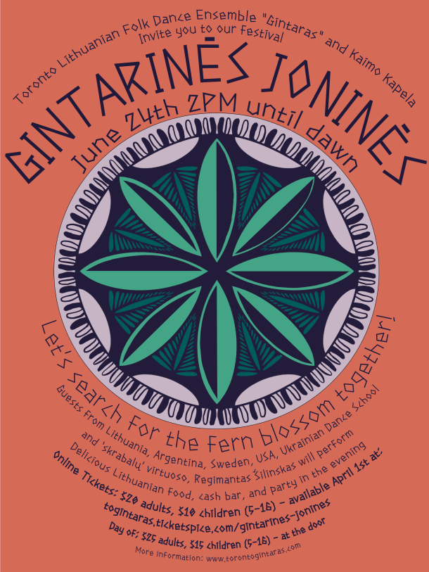 The last day to purchase tickets online will be June 18th ($20/$10) – otherwise tickets can be purchased at the door ($25/$15). togintaras.ticketspice.com/gintarines-jonines